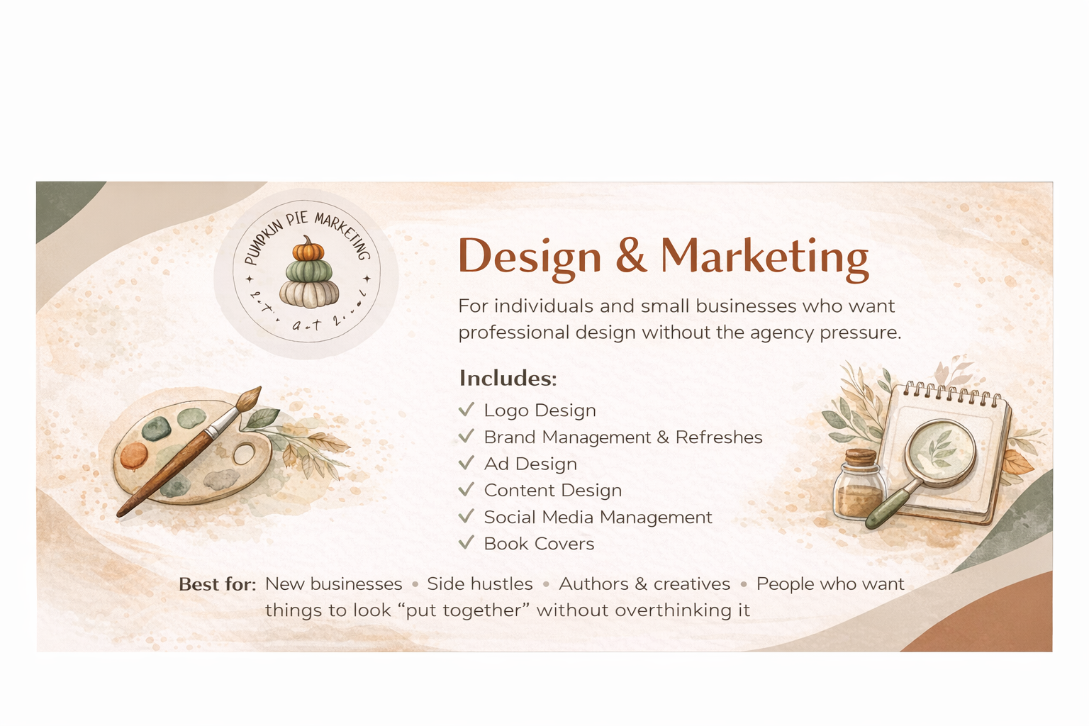 This page is for individuals and small business owners who want their brand, content, or online presence to look professional without needing a big budget or a full agency. Whether you're just starting out or tightening things up, we're here to help you figure out what makes sense for your business.